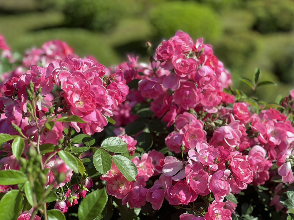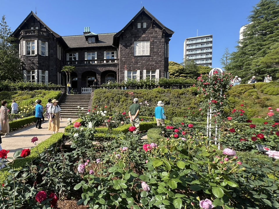 洋館の雰囲気にマッチするバラが咲く。見頃は春バラが5月中旬から6月、秋バラは10月中旬から11月。全体は貴重な大正時代の近代庭園で和洋の調和が魅力。庭園は国の名勝。