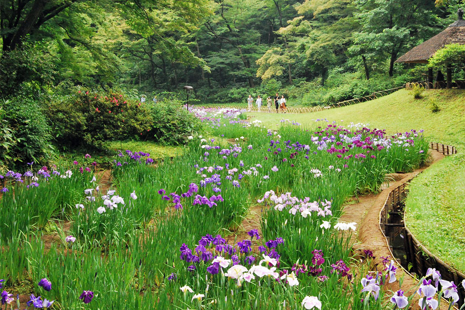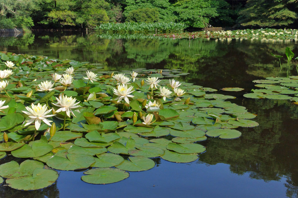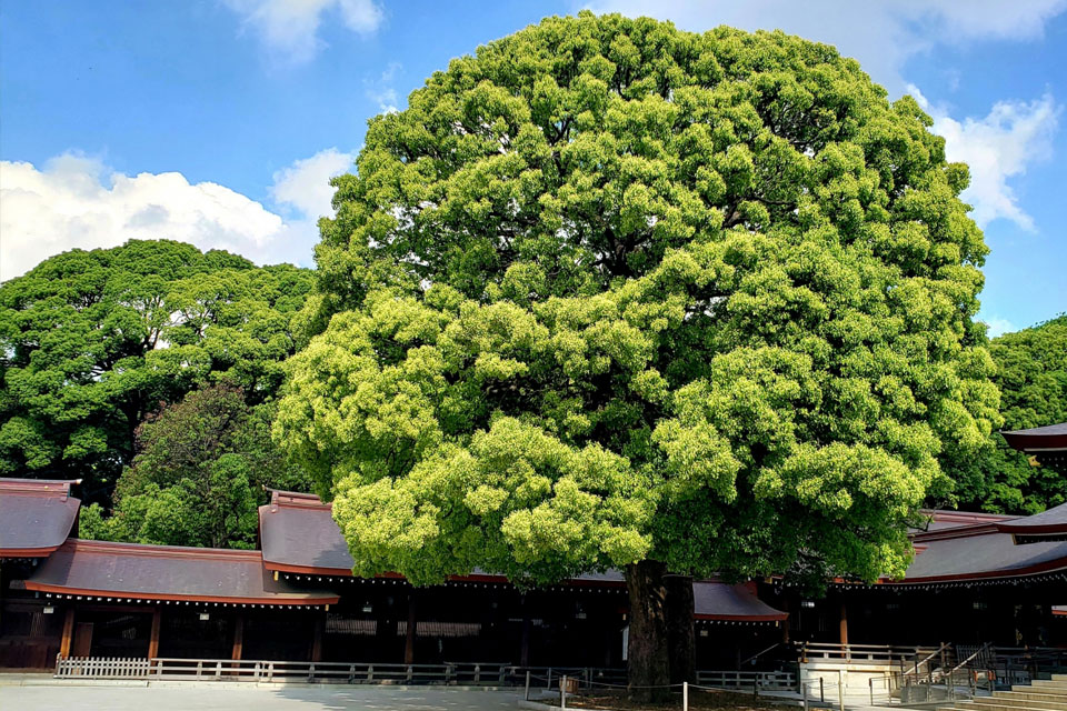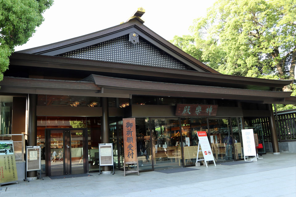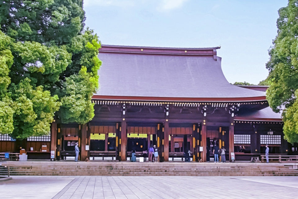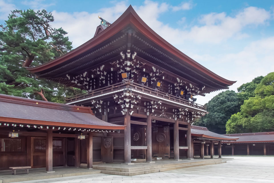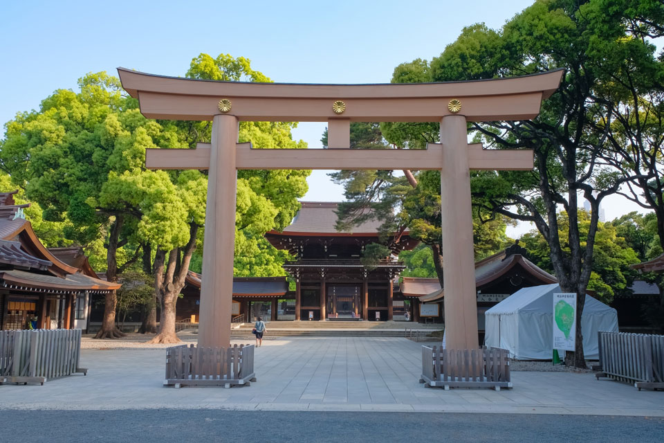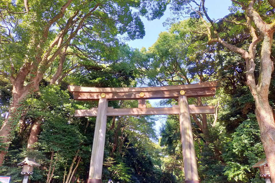 1920(大正9)年創建、御祭神は明治天皇と昭憲皇太后。約70万㎡の広大な鎮守の杜につつまれ、都心とは思えない環境。本殿、内拝殿、外拝殿などの社殿が並ぶ。「宝物殿」、「明治神宮ミュージアム」などの施設や、杜には、名湧水「清正井」、花菖蒲が人気の「御苑」、睡蓮やコウホネの花が咲く「南池」などの見どころがある。初詣は例年参拝者数日本一。JR原宿駅西口すぐ。