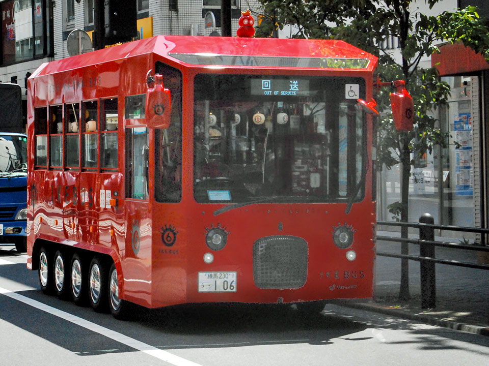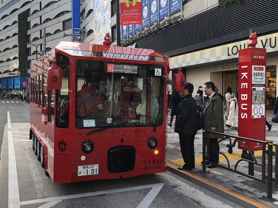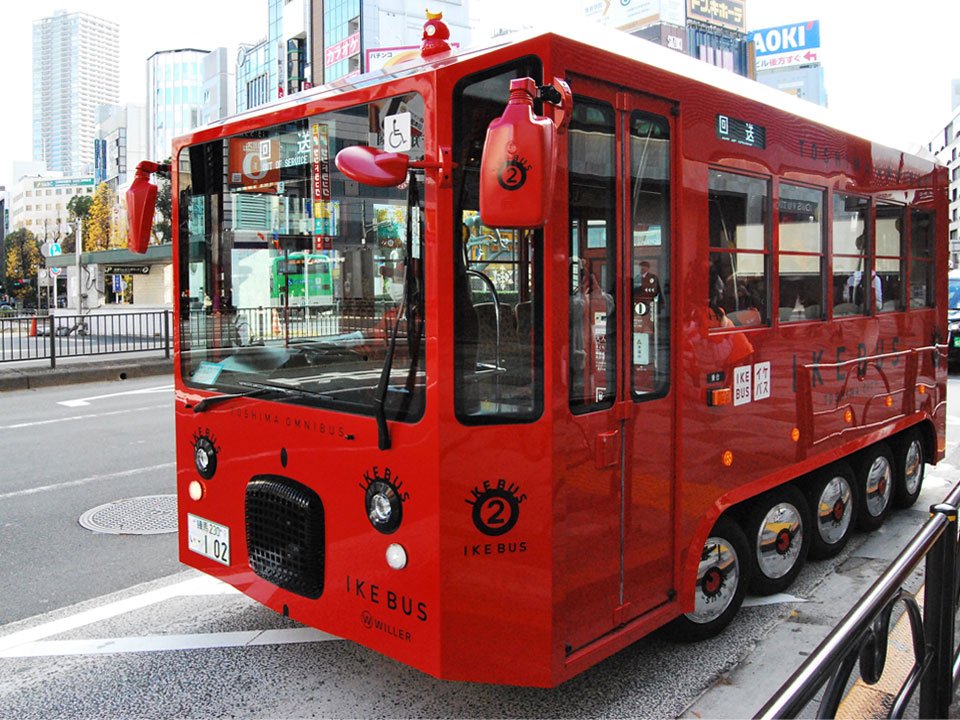 池袋の街で目を引く循環バス「IKE BUS」。タイヤが片側5輪ついたかわいい姿。デザインは、JR九州「ななつ星」などを手掛けた水戸岡鋭治氏。最高時速19kmで走る電気バスで、走行音も静か。東口と西口に各1系統。南池袋公園やサンシャインシティ方面を回っている。移動はもちろん、循環ルートを一周乗車して観光する利用もある。車窓がゆっくり流れ、思わぬ再発見もまた楽しい。
