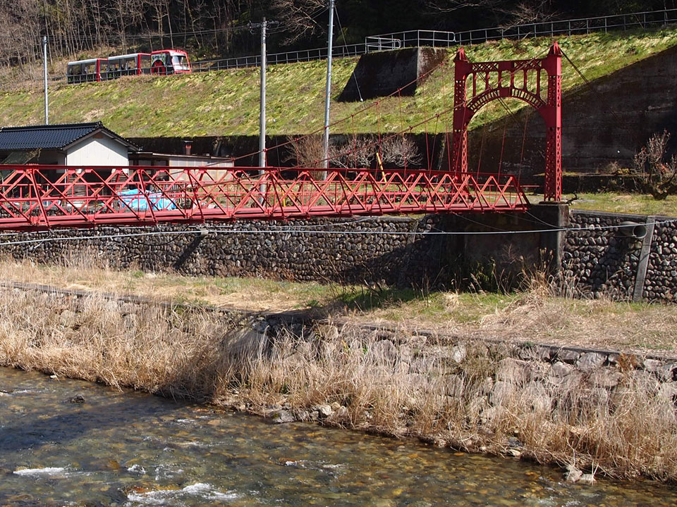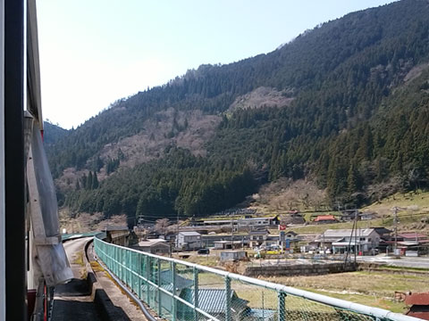 途中2ヶ所の橋と5ヶ所のトンネルがあり、春は桜並木の下を走る区間もある。 |