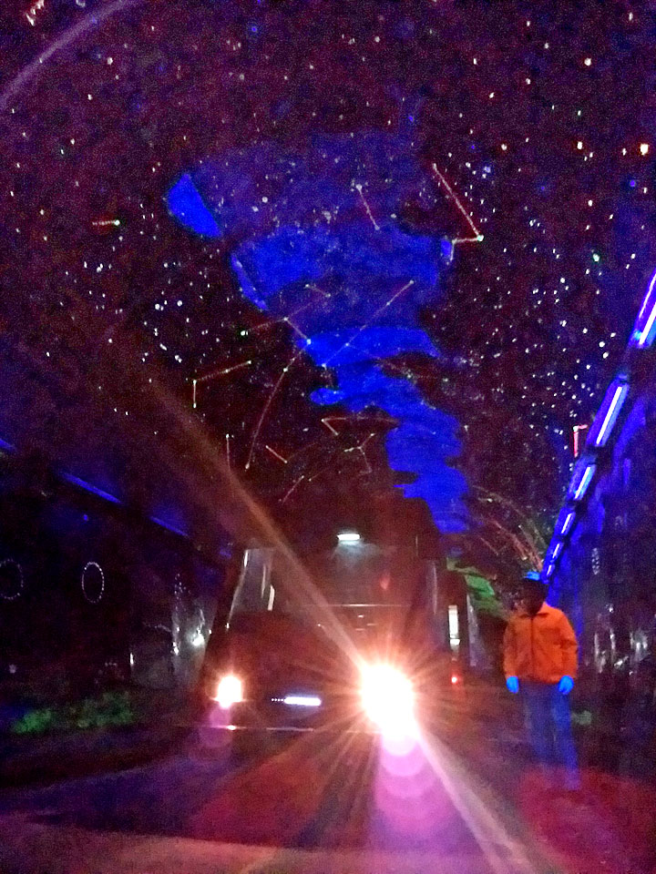錦町駅に一番近い広瀬トンネルが「きらら夢トンネル」。全長1,796mで、そのうち約600mもの区間が光る石で装飾されている。360度装飾されたところも2ヶ所ある。