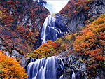 ブナ森の麓、標高800mの高原にかかる。付近の渓谷を中ノ俣渓谷と呼ぶが、その上流にかかる。駐車場から徒歩約40分。下の滝から急坂を登ると上の滝を見下ろす場所に出られる。岩の形で左右へ流れが変化する様はこの滝ならではの美しさ。冬は下流の打当温泉から先は通行止。日本の滝百選 |