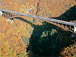 全長360m、アーチ支間長255mの日本一の上路式アーチ橋。津軽と南部を結ぶ国道394号線の難所だった城ケ倉渓谷をひとまたぎ。川床からの高さは122mもある。橋の上からは八甲田連峰や青森市街、岩木山を望め、眼下には柱状摂理の断崖が続く城ヶ倉渓谷を見下ろせる。 |