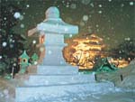 2月上旬、雪に覆われた弘前公園に、市民や団体による200基の雪灯籠が立てられ、蓮池のまわりには約300のかまくらが並ぶ。メイン会場は四の丸で、大雪像が造られ、大型滑り台、シャンシャン馬ソリなどの楽しみなど多彩なイベントが実施される。夜になると、灯籠が明かりが入り、照明と共に弘前城、かまくら、大雪像を照らす。みちのく五大雪まつりといわれる。 |