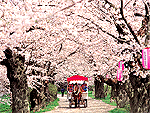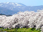 角館を流れる桧木内川左岸の堤に沿って約2km、約400本のソメイヨシノが連なる。1934(昭和9)年に天皇誕生記念として植えられた。堤はスケールの大きな桜のトンネルに、中を歩けば美しい桜の世界につつまれる。残雪を抱く周辺の山々の風景もいい。4月中旬〜5月上旬には桜まつりが開催され、夜桜ももちろん楽しめる。日本さくら名所百選、国の名勝。 |
