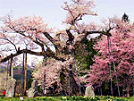 郡山中心街から東南東約11kmの山間。「三春の滝桜」から約4km。三春の滝桜の娘と言われている。枝振りも立派な風格ある巨木全体に紅色の花が咲くと見事な美しさ。桜の下には地蔵堂がある。また、周辺にはしだれ桜の見どころが多く、シーズンには桜めぐりができる。地蔵桜の見頃は4月下旬頃で、三春の滝桜より少し遅い。 |
