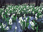 網走湖の女満別側を女満別湖ともいうが、この湖畔では雪融けと共に草花が一斉に目を覚ます。ヤチダモとヤチハンノキなどの広葉樹自然林が約56haにわたって茂り、その原生林の中に水芭蕉群落が見られる。周辺の環境や群落の規模からいっても、他ではなかなか見られない貴重なもの。見頃は、4月下旬から5月下旬。国の天然記念物。 |