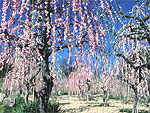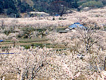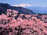 甲府盆地はブドウや桃の栽培が盛んで、生産額は日本一。桃畑は旧一宮町が中心で、どちらを見ても桃畑。春になると、あまりに広大な桃の花園。花畑に民家が浮かんでいるかのようで、素晴らしい景観。盆地の端で斜面になっているため、高台から見渡すことができる。花の見頃は4月中下旬。 |