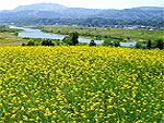 飯山市から野沢温泉に向う途中の小高い丘の上で、高野辰之作詞の文部省唱歌・おぼろ月夜のモチーフとなった場所といわれる。千曲川周辺一帯が黄色い花の大群落。千曲川、斑尾山、菜の花の丘と、のどかな風景が心にしみる。夕暮れの景色もきれい。夏はひまわり畑に。5月3日には菜の花まつりが開催される。菜の花の見頃は4月下旬から5月中旬。 |
