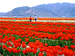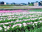 民間最大級の規模を誇るチューリップ園。ここでは200種類以上ものチューリップが生産・販売されている。4月上旬から5月上旬までのチューリップまつりでは、咲いているチューリップを球根ごと掘り取って、翌年また花を咲かせる楽しみと共に持ち帰ることができる。(2本まで大人入場料に込み) |