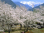 残雪を抱く北信五岳(飯綱山、戸隠山、黒姫山、妙高山、斑尾山)を背景に、桃の花が一面に咲く。桃畑は約10ha、約1700本の規模。タンポポや菜の花も多く、桃色と黄色の競演で見事な色彩になる。丹霞郷は画家・岡田三郎助が「丹い霞がたなびいているようだ。」と絶賛したのが名の由来。見頃は4月下旬から5月上旬頃。 |