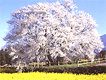 樹高14m、幅26mもの大きな桜。島津氏との戦いで散った峯伯耆守惟冬の菩提樹とされ、妻と息子が故郷に帰り御霊を弔うため一心に行をおさめたために名付けられたと伝わる。50年程前には落雷によって根本付近が裂けて幹が分かれた。満開になると桜の花で大きな半円球になる見事な眺め。広い臨時駐車場も満車になるほど賑わう。 |