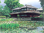 八代城主・松井直之が1688(元禄元)年に建てた茶室。当時は八代海の浜と松を望めたことが名の由来。別名「浜の茶屋」。広さ約9千uの庭園が美しく、特に肥後ハナショウブが咲く時期には観光客で賑わう。宝物館には松井家の所蔵品などが展示されている。6月第1日曜には肥後古流のお茶会が開催される。ハナショウブの見頃は5月下旬から6月上旬頃。国の名勝、史跡。 |