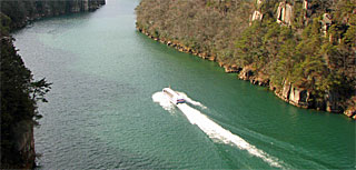 大井ダムによってできた木曽川の細長いダム湖で、両岸が絶壁で峡谷の趣がある。金床岩、獅子岩、屏風岩、品の字岩などの奇岩が連続する景勝地。品の字岩(シナノジイワ)まで往復する高速ジェット船での鑑賞が一般的。往復約20kmで、乗船時間は約30分。