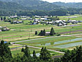 | 岩村盆地の農村景観を眺められる国道363号線沿いの展望台。緩やかに傾斜した田園に、瓦や白壁の農家や土蔵が点在する風景が広がる。盆地の周辺には、遠く三河や尾張の境付近の山々まで二重・三重に連なっている。水田が輝く田植えの頃や実りの稲穂が揺れる頃など、四季の移ろいも楽しい。「農村景観日本一」は、1889(平成元)年に環境問題を専門に研究している京都教育大学の木村教授より名づけられた。 |