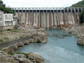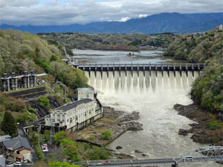 愛知県との県境、矢作川を堰き止めた高さ100m、長さ319mのアーチ式ダム。