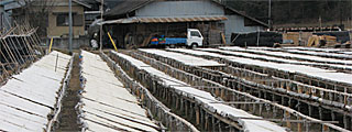 法面は下半分が石積み。中央を流れる坂折川には水車小屋が復元されている。棚田の中腹を県道が通り、脇に東屋などがある展望台が整備されている。棚田の様子を間近で見え、周辺の美しい風景も見渡せる。日本の棚田百選。 |