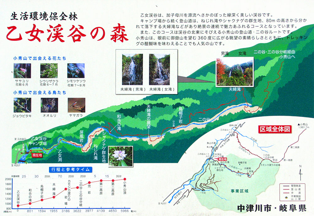 | 落差80mの夫婦滝をはじめ、ねじれ滝、和合滝など大小の滝が続き、天狗岩、烏帽子岩などの奇岩がそびえ立つ景勝地。、5月下旬頃に花が咲くシャクナゲ群生地も楽しみ。渓谷沿いに遊歩道が整備され、深い自然の美しさを満喫できる。入口から夫婦滝までは約1.9km、徒歩約60分。さらに、御岳を展望できる小秀山へと登山道が続く。 |