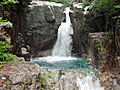 | 付知峡の奥に位置し、ランプの宿・渡合温泉から石清水歩道で約15分。木曾ヒノキやサワラの大木など、深山の雰囲気につつまれての散策となる。 まずは落差20mの木曾越の滝、全体を見るのは難しく横から一部を眺めるか滝上の橋から見下ろす。その橋を渡ると、落差5mの子滝と落差15mの親滝に進める。 |
