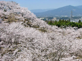 | 苗木城跡の北方で、山全体に桜が咲く。花の時期には緑に浮かぶ桜の山を、苗木側から確認できる。植樹を重ねその数は約1,000本。 高台のため街中より遅い花見が楽しめる。夜のライトアップをはじめ桜まつりが開催されてにぎわう。 頑張って展望台に登れば、眼下に広がる桜の花越しに苗木地区や周辺の山々が見渡せる。 |