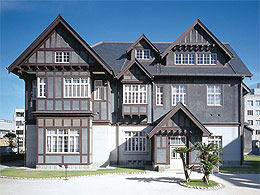![]() 旧門司三井倶楽部 骨組みが外に見える外観や大小5つの切妻屋根が印象的。アインシュタインイ博士夫妻が滞在した部屋が2階に復元されているよ。国の重要文化財。 |