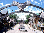 阿寒湖温泉街の西側。通りの両側に民芸品店などが30数軒並び、中には伝統工芸や木彫などを実演する店も。中央にあるオンネチセでは「アイヌ古式舞踊」(国の重要無形民族文化財)が公開されている。また、古きアイヌ民家を再現したアイヌ生活記念館やアイヌの暮らしや営みなどのクラフトアートなどを鑑賞できるニタイトー森と湖の芸術館などの施設もある。 |