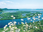 根釧原野にある太平洋に面した3万1千平方mもの広い湿原。200種に及ぶ鳥類・植物が生息する自然の宝庫。別名「花の湿原」とも呼ばれる。6月中旬から白いワタスゲが一面に咲き、次いで紫色のヒオウギアヤメ、黄色のエゾカンゾウと、次から次へ花が咲き継ぎ、湿原の色が見事に一変する。琵琶瀬展望台からは広大な湿原と蛇行する琵琶瀬川、反対側には琵琶瀬湾を望める。北海道遺産、ラムサール条約登録湿地。 |