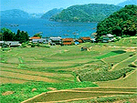 高浜の西端、若狭富士と呼ばれる青葉山の北側の海岸線。棚田は日引集落の上部に約200枚。限られた耕地に小さな田が寄り添っているかのよう。棚田の上が一般道で、斜面に広がる棚田と穏やかな漁村、波静かな内浦湾が調和した美しい風景を一望できる。湾の対岸には高浜原発が見える。日本の棚田百選。 |