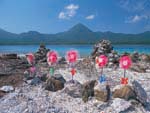 鹿児島市街から錦江湾を隔てた対岸に望めるため、鹿児島の象徴的な存在。今も噴煙を上げる標高1117mのコニーデ型複式火山。1914(大正3)年の大噴火で大隅半島と陸続きになった。北岳、中岳、南岳が並び、南岳は現在も活動中で断続的に噴煙をあげている。火山灰台地特有の農作物・桜島大根が知られている。島内には埋没鳥居など噴火を物語る史跡が見られ、火山の威力に驚かされる。 |