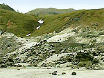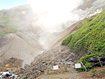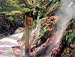 渓流沿いの岩肌から蒸気や熱湯があちこちで噴出。渓流沿いに遊歩道が設けられており、ゆっくり歩いても往復30分程。高低差はほとんどない。遊歩道沿いには、熱湯や熱気が絶えず吹き出す所が点在する。すぐ脇で轟音と共に噴出しているところも。渓流は暖かい。珍しい不思議な光景だ。 |
