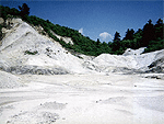 笠山が爆発して出来た爆裂火口の跡。剣ヶ峰と呼ばれる絶壁がそそり立ち、赤茶けた地面には多くの噴気孔があり、ガスや熱湯を吹き出している。谷に流れ込む水はここで過熱されて70℃近い温泉となる。そこに大地獄を中心に15の地獄ができている。入口に展望台や1周約600mの遊歩道から噴火口跡を見られる。北海道遺産。 |