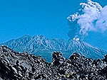 赤茶色をした独特の山容で今も雲煙を上がる |