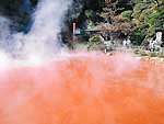 別府市街地から北西部の鉄輪温泉付近に集中している。地獄とは地中深くから吹き出す熱湯、熱泥、噴気のことをたとえて言う。池一面が赤色の血の池地獄や、熱湯が50m以上の高さに噴き出す竜巻地獄をはじめ、金龍地獄、白池地獄、鬼山地獄、カマド地獄、山地獄、海地獄、坊主地獄がある。本坊主地獄を除く8地獄を約2時間20分でめぐる定期観光バスが出ている。 |