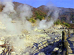 標高約800m。草木が生えない灰白色の溶岩が広がる中、いたるところから蒸気が吹きだし、強い硫黄臭があたりに漂っている。起伏のある斜面は荒涼とした風景で、遊歩道が整備されている。807(大同2)年に同窓和尚によって開山されたと伝わる。恐山、立山と並ぶ日本三大霊地の一つとも。 |