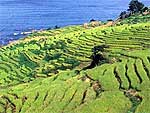 輪島の東、曽々木へ向かう国道沿いの棚田。1枚の広さは平均0.06アール(1.8歩)で畳1畳程度。海と共に見渡せる棚田は美しさと人間の営みに感心させられる。ここで収穫される米は全て手作業で作られるため味が格別といわれる。 |