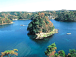 湾口が0.35kmに対して延長が12.5kmというの典型的な沈降海岸。湾の中央に浮かぶ蓬莱島や湾内を遊覧船が巡る。湾口の日和山は自然公園になっており、箱庭のような湾を一望できる。水の透明度が高く、海藻や魚が多いことで海中公園の指定を受けている。 |