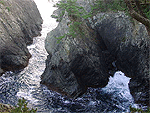 船越半島の東南。大きな岩礁に挟まれた水路があることから「海のクレバス」とも呼ばれる。船越半島の中でも、特に雄大な男性的景観が堪能できる名所。見学には、田の浜漁港から釣船を利用。タブの大島、小谷鳥海岸を見つつ大釜崎へ。狭い水路を見事な舵さばきで船が通り抜ける。 |
