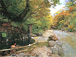 約6kmにわたる渓流。渓谷に入って最初の大きな滝・一ノ滝は幅のある水量の多い滝。たろし滝は、厳寒期になると沢水が崖の中腹で凍って大きな氷柱になる。「たろし」とはこの地方でつららのこと。例年2月11日に氷柱の太さを計測し米の作柄を占う。氷柱の太さは8mになることも。 |