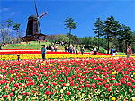 自然を生かしてオランダ風に整備された森林公園。園内には、高さ16mの風車展望台や5月上旬が見頃の約15万本のチューリップ園、長さ154mの赤い吊り橋・メモリアルブリッジ、木炭資料室、レストラン、メニーサイドハウス、チビッコ天国・丸太の遊具などの施設が揃う。 |