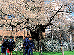 盛岡地方裁判所の前庭にある樹齢約400年の桜。周囲21m、高さ1.7mの大きな花崗岩を割って生えている。樹高10m、根回り4.3m。盛岡市内では1番早く咲き始め、枝一杯に花をつける。花の見頃は4月下旬から5月上旬。国の天然記念物。 |