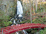 桜松神社境内にある落差15mの滝。中段に石彫りの不動尊が祀られ、滝の手前に架かる赤い橋から滝を見上げることができる。雪解けの頃などは水量が多い。かつては修行の場所だったとされ、滝への歩道途中にも神が祀られている。また、神社境内には縁結びの木がある。国道282号に案内板、神社駐車場から徒歩約5分。日本の滝百選。 |