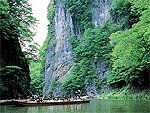 北上川の支流、砂鉄川が石灰岩を浸食した渓谷。約2kmにわたって高さ100m程の絶壁や奇岩が屹立する。探勝には手漕ぎ舟が便利。船頭の歌う「猊鼻追分」を聞きながら渓谷美を堪能できる。売店でエサを買って川にまくと、多くの魚が舟についてくる。5月下旬には藤の花が絶壁に咲き、10月下旬には紅葉が美しい。国の名勝。 |