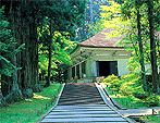 850(嘉祥3)年に慈覚大師によって開山、12紀初めには藤原清衡が堂塔40余、僧坊300余もの寺院を築いた。14世紀の火災で多くの堂宇を焼失したが、金色堂と経蔵の一部は残った。山内には弁慶堂、本堂、鐘楼、旧覆堂、不動堂などが点在する。金箔を張りめぐらした金色堂は国宝第1号で、国宝や重要文化財を含む約3千点もの寺宝を保有する。天台宗東北大本山。国の特別史跡。 |