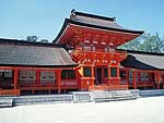 本殿と朱塗の回廊、釣燈篭や桧皮葺の社殿 |