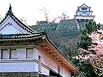 生駒親正が高松城の支城として1597(慶長2)年に築城。三層の天守閣、大手一ノ門、御殿表門が現存する。石垣は、日本一の高さを誇る四段階で、曲線が美くしく、三重三層の天守閣(国重文)を引き立てている。標高66mの亀山にあり、城下町・丸亀の風景には欠かせない存在。