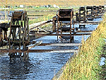 4つの集落を潤す灌漑用水路「四ヶ村溝」から田園に水を引くのどかな風景。以前は数多くの水車が設置されていたが、現在では数基残るのみ。観光用に設置された木造の水車が3月から10月にかけて活躍している。水車近くには公園が整備されている。初夏には、水路沿いのアジサイがきれい。 |