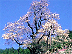吾川村の東北部山腹にあるウバヒガンザクラの古木。樹高約30m、根回り約8mの巨木で、樹齢は約500年。つぼみの形がひょうたんに似ているのが名の由来。四方にのびた枝いっぱいに薄桃色の花を咲かせる。開花期間は売店も出て、夜はライトアップされる。見頃は4月上旬。 |
