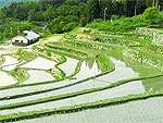 急斜面を切り開き石を積み重ね、幾重にも続く階段状の水田が見事。約2.5haにわたって棚田が広がり、四季折々の風景が輝く。体験農業やオーナー制度が好評、遠方からの参加者も多い。制度が定着し、美しい景観が守られている。棚田を見下ろす高台に観音堂が祀られ、そばには昔の台風で折れた樹高6m、樹齢約800年の大杉がある。日本の棚田百選。 |