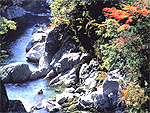 石灰岩の山が浸食された断崖が続き、原始林に囲まれた清らかな渓流。飛龍の滝は迫力ある落差60mの滝で遊歩道で近くまで行くことができる。他にも「昇龍の滝」、「背龍の滝」、「みかえりの滝」など見応えある滝が多い。河原の岩が美しいもみじ公園や乙女河原、とうろく様、千仞峡など見どころが多い。渓谷内にある宝来荘では食事や宿泊ができる。 |