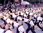 朱塗りの鳴子を鳴らし「ヨッチョレ、ヨッチョレ」のかけ声と共に踊り子が追手筋など高知の街を踊り歩く。組ごとち工夫を凝らした衣装も楽しみ。毎年8月9日が前夜祭、10、11日は鳴子踊りの本番、12日には後夜祭とよさこい全国大会、13日は花火大会。市内には15ヶ所の競演場・演舞場がある程盛んで、祭りは200近い組・2万人程の踊り子が参加する。街中はまさに祭り一色。 |